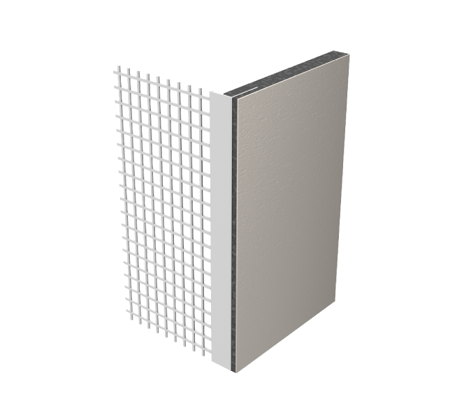 Dämmstoffplatte aus EPS oder Mineralwolle mit spezieller Vliesbeschichtung und integriertem Gewebeeckwinkel zur einfachen und rationellen Ausführungen von Fenster- und Türlaibungen.