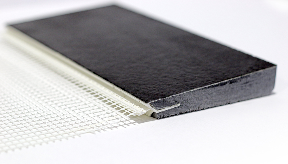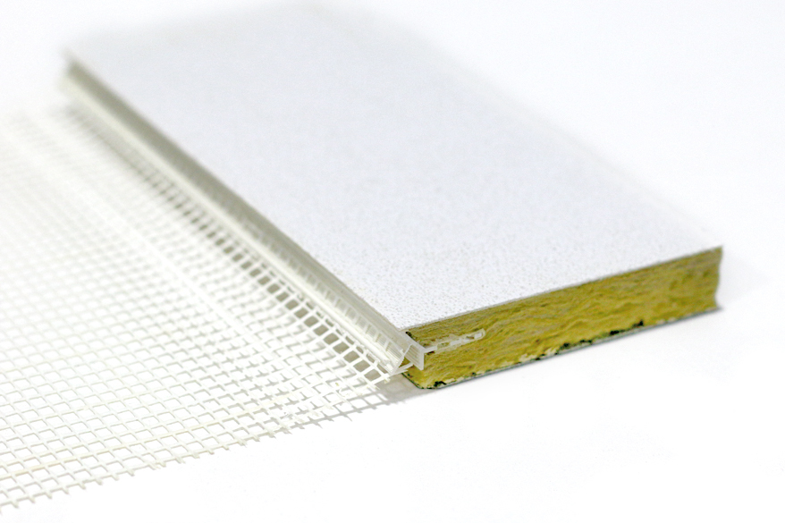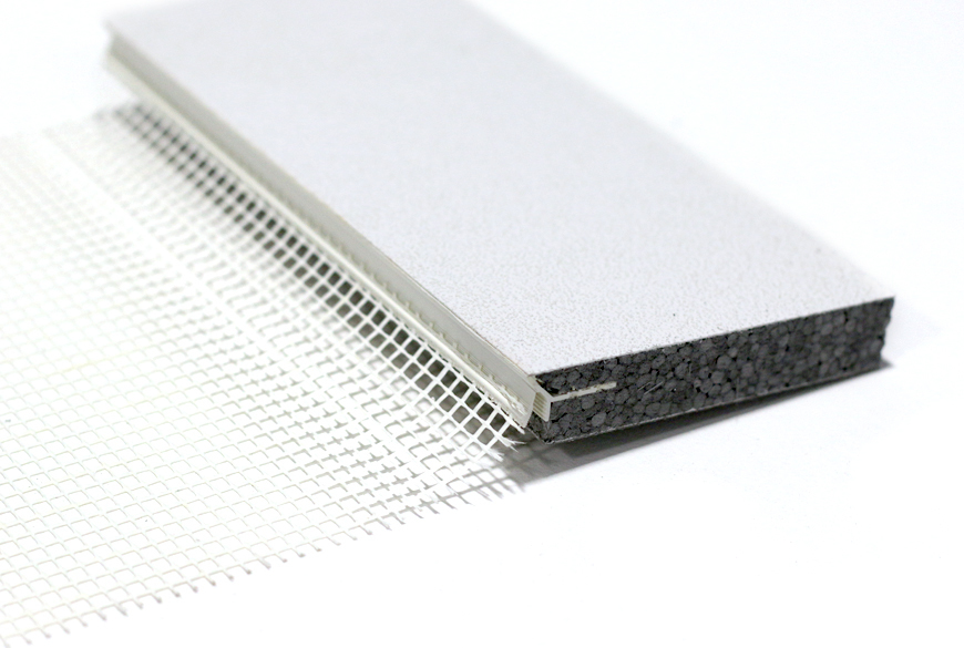 Dämmstoffplatte aus EPS oder Mineralwolle mit spezieller Vliesbeschichtung und integriertem Gewebeeckwinkel zur einfachen und rationellen Ausführungen von Fenster- und Türlaibungen.